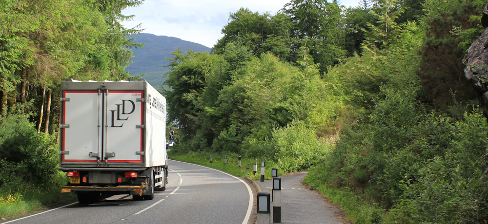 08 back on the A828, Ruth hiking up the West Coast of Scotland
