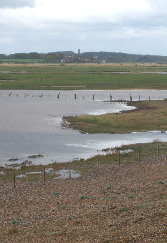 The path sometimes runs on the edge of the beach, sometimes on the raised sea bank and sometimes behind the bank. When it runs behind the bank, the ground is grass instead of shingle and we have some shelter from the wind. But the tide is high, and this area behind the bank is often flooded with what appears to be sea water that has seeped through the shingle.
