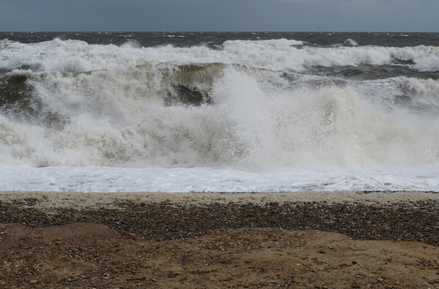 The beach is shingle and stretches on either side for as far as we can see. Huge grey breakers are crashing. The water roars and the wind howls.
