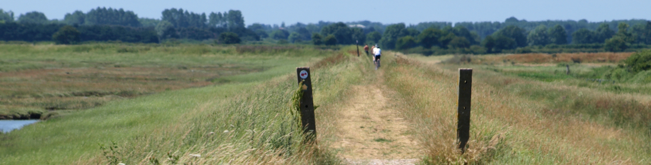 Some distance along the coast and I reach a marshy area. The path follows the sea defence wall around the edge of the marsh and the way ahead is long, flat and straight. I meet a few dog walkers and some cyclists, but no serious walkers.