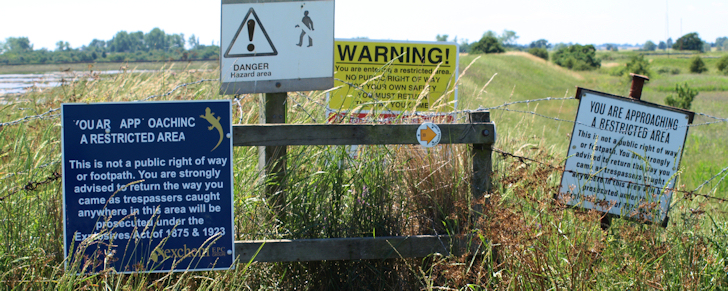 David Cotton recounts how he was unable to follow the sea bank around this section of the estuary – because of the barrier warning you must detour around an explosives factory. Sure enough, I come to some fierce warning signs threatening prosecution under the Explosives Acts. I am not usually deterred by “Private Property” signs, but this is the strongest warning sign I have met up till now.