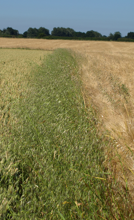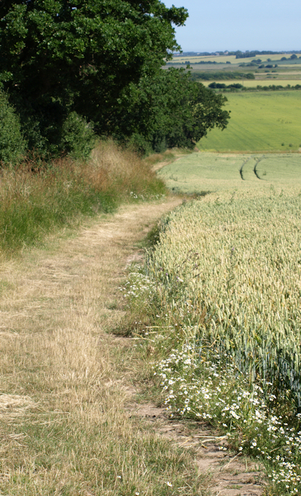 After lunch, I head downhill towards the estuary again. I follow a shady lane and then take a footpath across fields. The first section of the footpath is very badly maintained – being marked by a ridge of tall grass between two corn fields. I am sure this is the correct route and spot some flattened areas where other people have walked. It is hard going. The grass is even higher than the corn and the ends of the grass whip around my face. I develop a grass rash on my arms – the first time this has ever happened to me. I am hoping that there is no pollen left in the grass heads, dreading the onset of severe hay fever. I cannot see where I am walking. The ground is very uneven and I am fearful of stumbling and twisting an ankle.