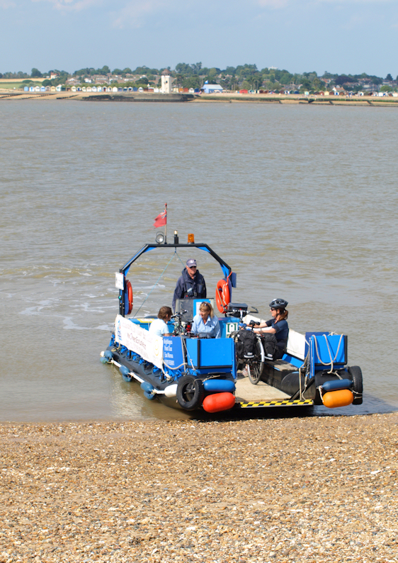 As we draw near to Mersea Island, I see we are going to pull up on a beach, where the sand rises steeply up from the waters edge. There are a number of people on the beach, enjoying the late afternoon sunshine. They seem surprised to see this strange little ferry rise up onto the beach. We disembark quickly and I take some photographs as a couple of cyclists wheel their bikes up the little ramp and sit in our empty places, ready for the journey back to Brightlingsea.