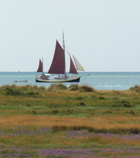 Now the path is overgrown with grass. I cannot see where I put my feet and I suffer my usual anxiety about snakes and, the more real danger, of twisting an ankle. To my left is reeds and marshes with water birds and, beyond the marshes, I notice the red sailed ship has rounded Colne Point and is sailing parallel to my path again. To my right are farmers fields and, as my nose identifies before I actually see it, a sewerage works.