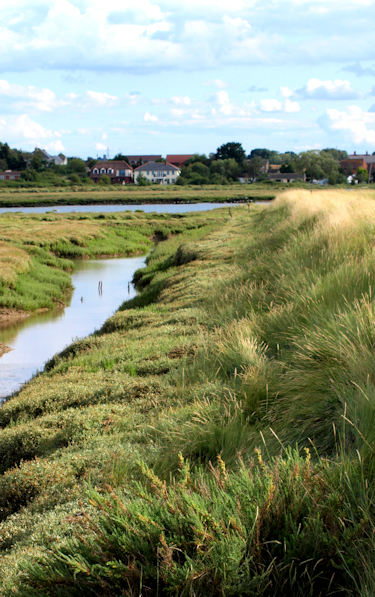 At the end of a rocky outcrop there is a wonderful modern statue of Byrhtnoth, the Earldorman of Essex, bold and fierce, looking out to sea. Byrhtnoth lived at the time of King Ethelred, 10th Century, and bravely stood against the Viking marauders, losing his life in the Battle of Maldon. The battlefield is just inland of this point.