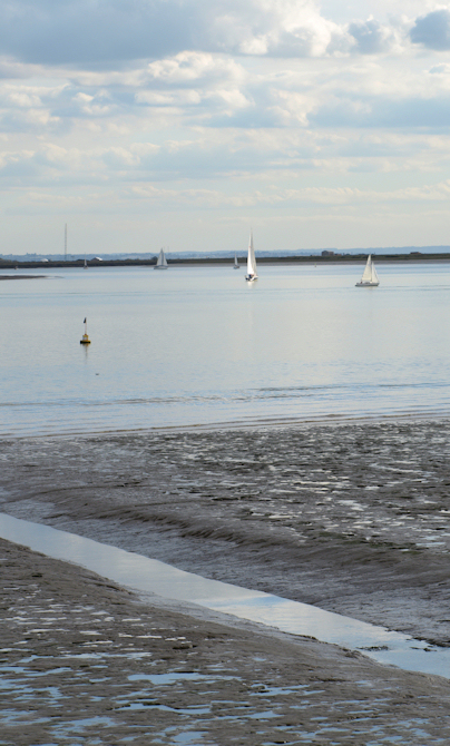 sailing ships on River Crouch, Essex, Ruth's coastal walkI enjoy this section of the walk. There is plenty to see. It is cooler now, the sun is behind clouds, and there is a strange, pale-blue light, giving an ethereal appearance to the water and the sailing ships on the river. There is hardly any wind. The tide is out and there are no waves. The ships move lazily across the water.