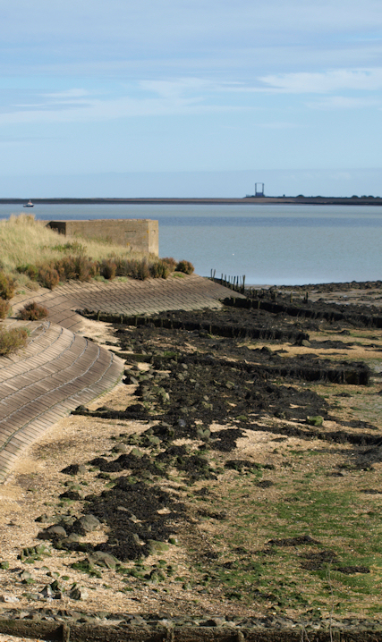 Pill-box sea defence, bank of River Crouch, Ruth's coastal walkContinuing, I reach the mouth of the River Crouch and enjoy watching the sailing boats. Along the bank of the river I come across defensive structures from the 2nd world war – pill-boxes. In some places, I notice a duo of pill boxes, with one facing the river and the other facing inland, both built into the river bank, back to back.