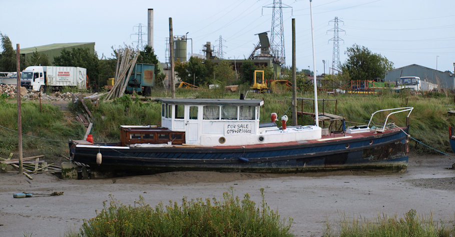 Wallasea Island is to my left and, as I walk along this stretch of river, I can see the marquees. This little stretch of water, separating me from Wallasea is called Paglesham pool. Ahead is the River Roach. As I round the corner and start walking along the river bank, I come across a crowded boatyard. I suppose it is a marina – there are some ships in the water – but most of the boats here don’t look as though they travel far. In fact, some don’t look as though they can float.