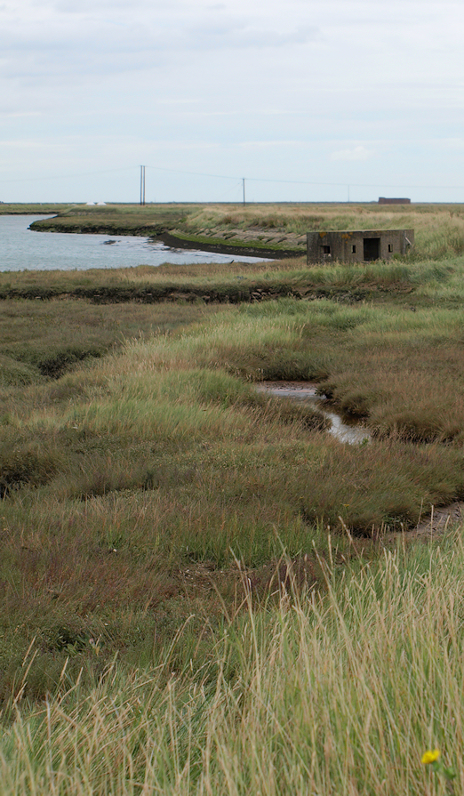 After crossing the causeway, I head off to the right along a foot path through fields. This is the route that will take me around Paglesham Creek and back to the sea wall. The sky is overcast and the light is too poor for good photography. In any case, there is not much to photograph here – fields, a path and the usual marshes. Along the way I see a number of the ubiquitous pill-boxes.