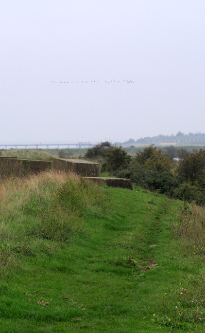 To my right, just inland of the bank, is a power relay station; I don’t know what the technical word for the structure is. This is where, I presume cables carrying electricity from Tilbury emerge after their journey under the Thames. From here pylons march across the fields, carrying their electric charge to homes and businesses.