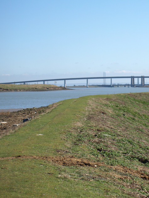 It is lunch time. Stopping to have a drink and a snack, I take in the view of across the narrow strip of water towards the Isle of Sheppey. A few boats make their way along the … is it sea or river? There seems to be a fair amount of industry on the Isle and ahead of me, looking along the bank, I can see the arch of the road bridge and distant traffic crossing too and fro.