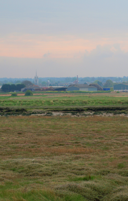 Faversham, viewed across Ham Marshes, Ruths coastal walk.I must confess, I found this section of the walk somewhat boring. There are smelly fields of yellow, oilseed rape flowering to my right, a featureless waterway to my left, beyond which are the flat fields of Ham Marshes with Faversham behind, lost in the distant haze. It is midday but the sun is obscured and the light is dull.