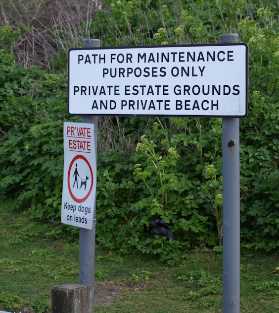 Private beach signs, Kent, Ruth's coastal walkThere are beach huts here and some, misleading, signs telling me this is a private beach. Misleading? Yes, because you can’t designate beach below the high tide mark as your own property – not in the UK – even if you own the land above the high tide mark, because all property below the high tide mark belongs to The Crown (i.e. the Queen), unless it has been officially designated differently, which is very rare.
