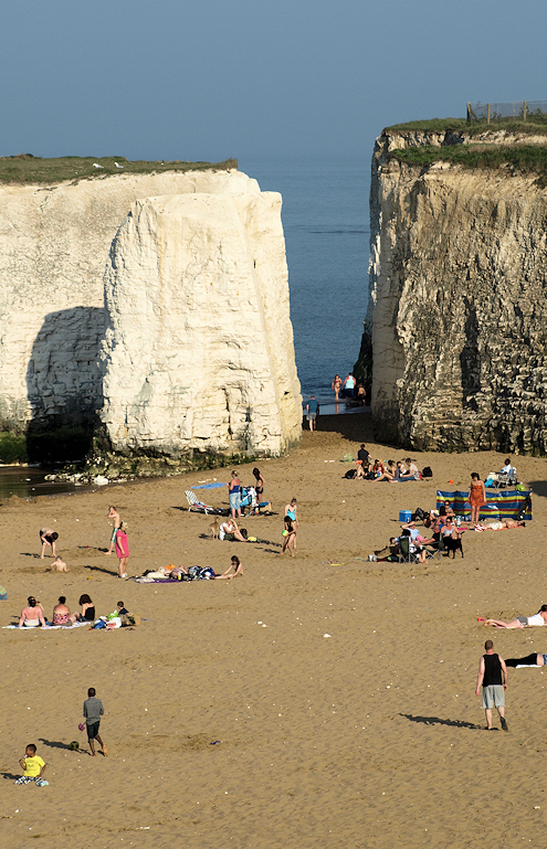 The next patch of my walk is truly beautiful. I walk through sandy bays, across an area used for jet skiing, along the bottom – and then along the top – of chalky cliffs, past a ruined fort. The sea has worn the coast and eaten chunks out of cliffs, creating interesting shapes. Families are out, sitting on the beaches and swimming in the sea.