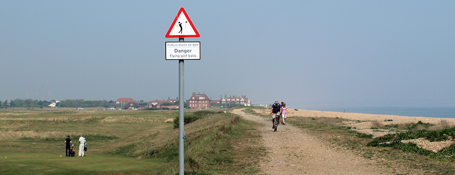 The road comes to an end and, from here to Deal, the path is a wide gravel track, raised slightly above the surrounding land. To the left is dunes, shingle and sea. To my right is mile after mile of golf course.
