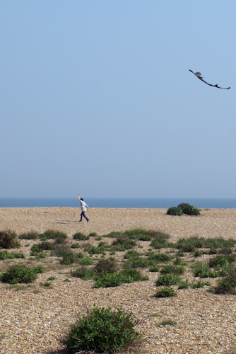 I am amused by a boy flying a kite in the shape of a shark. There is little wind today and he has to run across the pebble beach to keep the kite flying. It looks like the shark is chasing him.