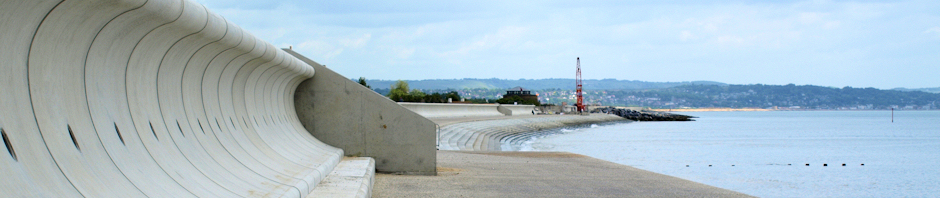 The defences are impressive. There are groynes in the sea – the tips of the wooden structures just visible below the waves. The stepped base of the wall leads up to a lower walkway with a high, curved wall (designed to reflect back the waves and minimise undermining of the structure) and a higher walkway above this, with a further wall beyond. This is part of our ongoing battle to contain the sea and preserve the shore.