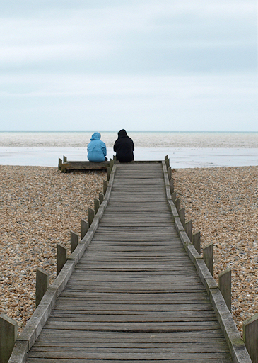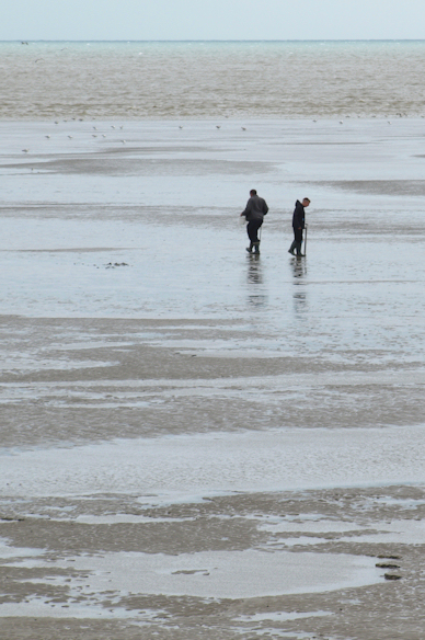 Two ladies, wrapped up against the chill of the wind, are sitting on the end of the wooden walkway. Two men (their husbands?) are out on the exposed muddy beach, digging for bait.