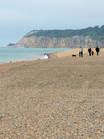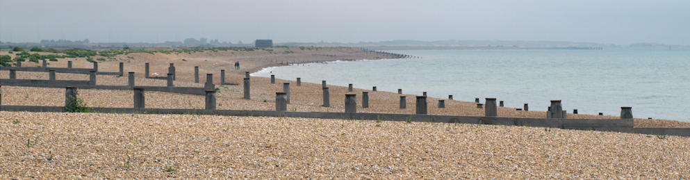 Looking in a south-westerly direction, the shingle beach stretches round a point and beyond, towards distant cliffs. That must be the aptly named ‘Cliff End’, shown on my map. There is a high cliff in the distance, pale in the haze, and I wonder if this is Beachy Head.