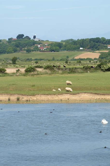 The clouds clear and the sun comes out. To my right, I look across Pett Level, across green fields dotted with sheep and up to a windmill on a rise. Somewhere, just before the land rises into a ridge, is the Royal Military Canal and the long distance path that runs along it.