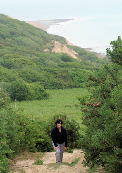 My husband is reluctant to give up the notion of getting onto the beach. Eventually I persuade him it is best not to risk broken bones. We turn back and scramble back up, the way we came, to rejoin the walk along the top of the cliffs.