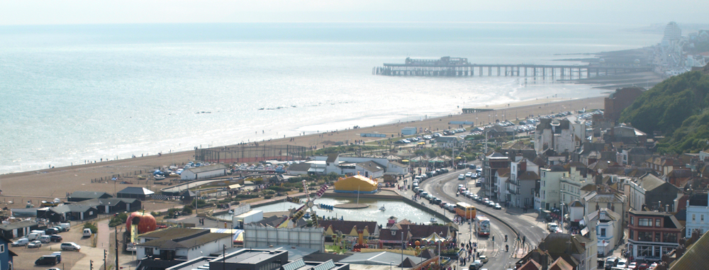 When we reach Hastings, there is a lovely stretch of greenery at the top, with an ice-cream van, and people walking. From here we look down on the town and its pier. It is late afternoon. The clouds have broken. The sun is in our eyes, bouncing off the water, turning the sea silver.