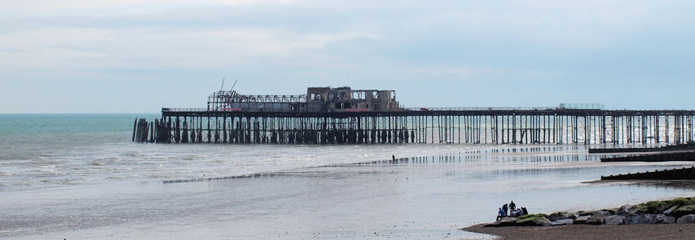 Ahead, as we walk along the promenade, we see the pier. It is a blackened ruin – broken and burnt. What a sad sight!