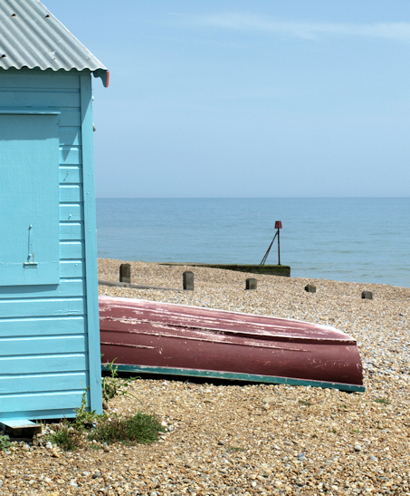Shingle beach with hut, Hastings, Ruth's coastal walkLeaving Hastings behind, I walk along a gravel path that runs along the side of the railway line, parallel to the beach and behind a jumble of huts, boats, fishing tackle, and sheds. I would prefer to walk on the beach itself, but the tide is in and there is no sand; I would be walking on rough shingle, too much like hard work, especially in this heat.