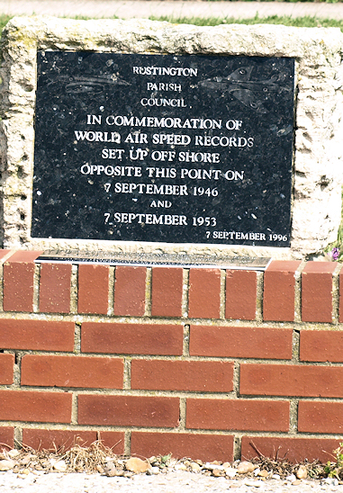 Speed records, plaque, Rustington. Ruth's coast walk in Sussex.As I walk along the top of the beach, through Rustington, I notice this plaque. Two world air speed records were set here; or, to be accurate, in the air just off shore from here. Both records were set about 60 years ago – before I was born – and have since been broken. But I am impressed. One was set in 1946 for an air speed of 616 miles per hour. The other was in 1953 for an air speed of 727 mph. I had no idea there were planes that could go so fast, all those years ago.