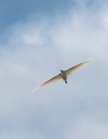 I really love these birds. They are unmistakable – completely white plumage and very stylish in flight. This might be a little egret, a common bird on the coast around here. But, I think, with the large wing span and paler legs and beak, this is probably great white egret.