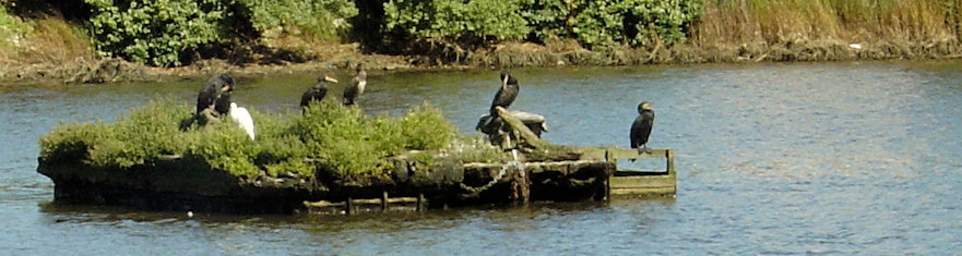 In the middle of Slipper Mill Pond is a small island. It is covered in the black shapes of cormorants. Among the black figures is a lone, white egret.