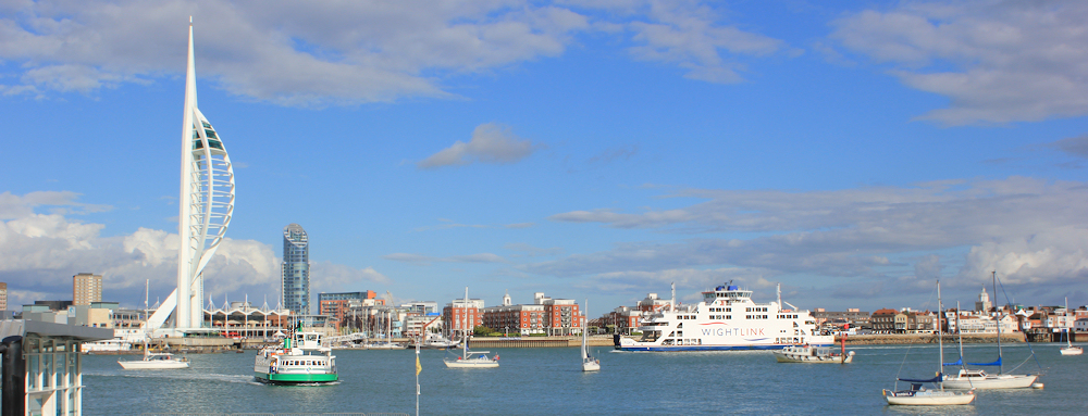 The sun comes out for the crossing and I take advantage of the few brief minutes, before we dock at Gosport, to take some photographs of the Spinnaker Tower and Old Portsmouth from the ferry.