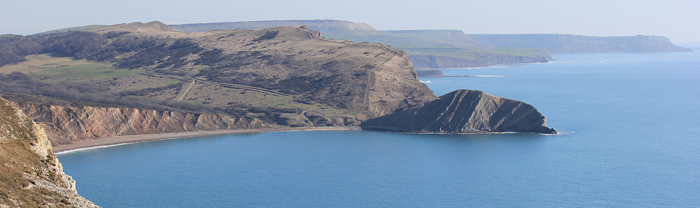 On the way up, I take photographs of the views down into Worbarrow Bay. The sun is shining, the air is clear and the sea is blue.