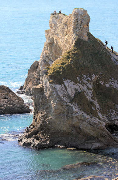Ahead are the striking rocks that mark the end of Mupe Bay. And another beach, with people walking down the path towards it.