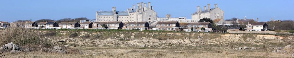 Below me are cliffs and the sea. To my right are quarry workings, with houses beyond and the young offenders institute.