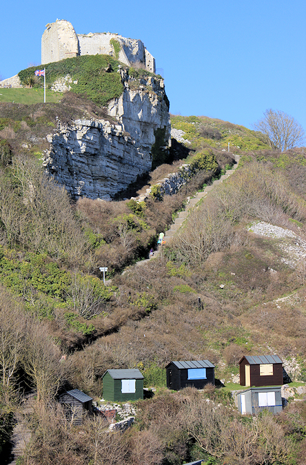 Rufus Castle, Portland, Dorset, Ruth on her coast walkI reach an old ruin – the remains of Rufus Castle. I meet more walkers. Signs point upwards and I can visit an old church if I want to. I decide not to detour and stick to the coast path. [Later I learn the church has a graveyard where local smugglers and pirates are buried. Their graves are marked with skull and crossbones signs and I was sorry I hadn’t visited it.]