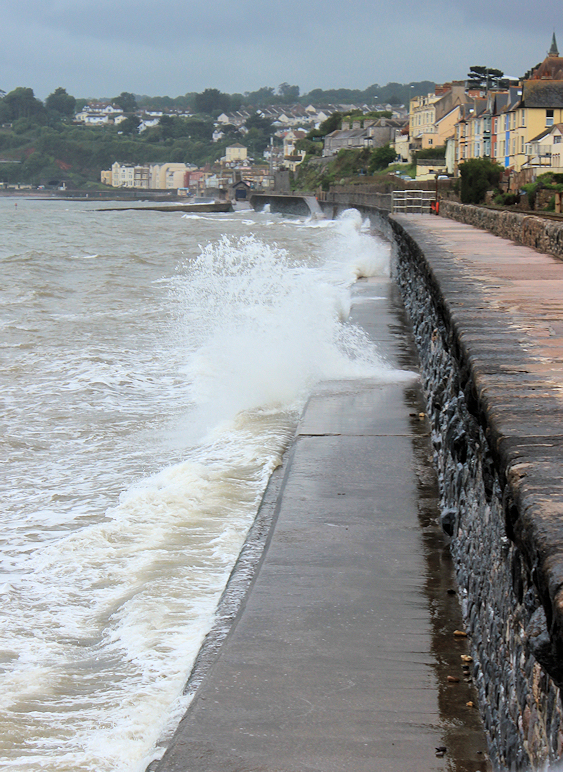 07 waves over Dawlish footpath, Ruth walking round the coast, Devon