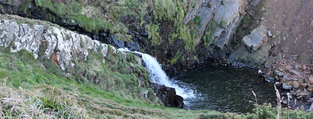 The climb is steep and narrow and the path winds along a series of ledges above the shingle of Blegberry Beach. Below a couple of dramatic waterfalls empty onto the shore.