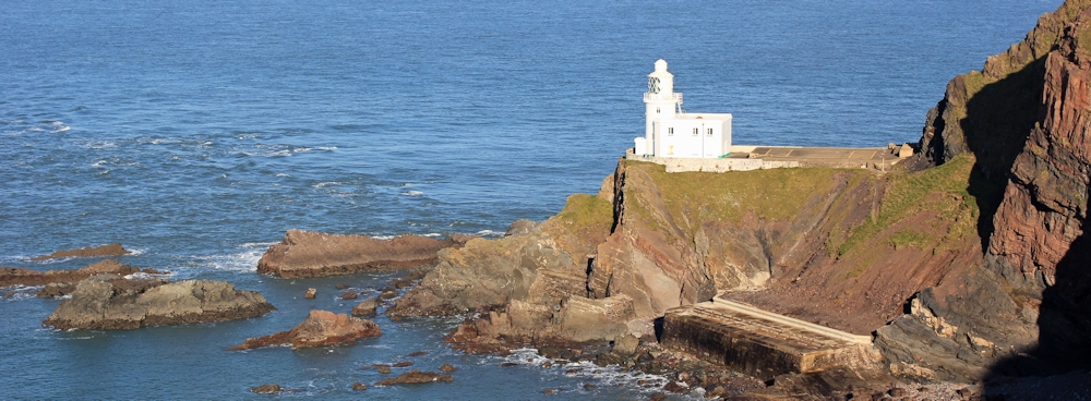There is a steep climb up the other side, and then a long haul up the slope of Upright Cliff. It is a relief to reach the relatively flat land of Blagdon Cliff. Ahead, across fields, we see a small building and a radio tower. Mistakenly, I think this is the Hartland Point Lighthouse and I’m disappointed by its squat structure. Where is the light?