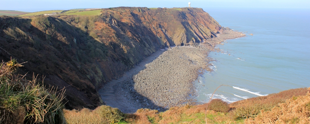 Picking up the South West Coast Path, I walk along North Cliff and stop, under the tower of the radar station, to take a photo looking back across the boulders of Barley Bay towards Hartland Point. The lighthouse is invisible, on the other side of the Point, but you can see the track that leads to it running downwards and around.