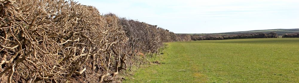 The path runs along the side of fields and is hemmed in by hedges. On my left, somewhere, must be the cliffs that fall down to the sea, but I don’t have access to the views because of overgrown gorse and brambles.