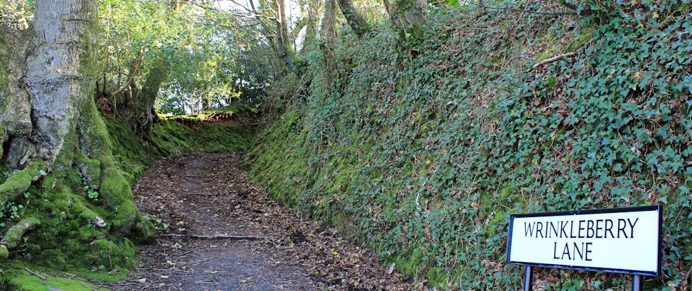 This must be it. Wrinkleberry Lane. It is unusual to see a footpath marked with a street sign, and I hesitate. Have I made a mistake? Is this a proper road? No. It would be impossible to get a car along here, and there are even steps in places. It must be a public bridleway.