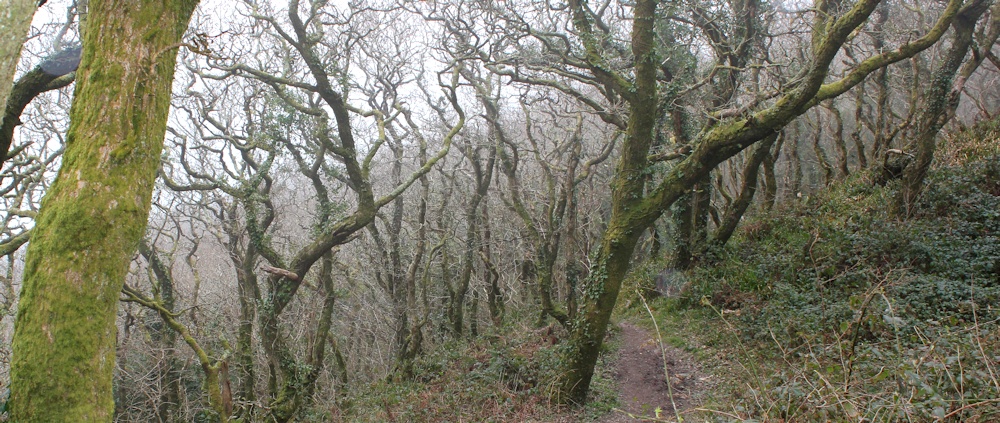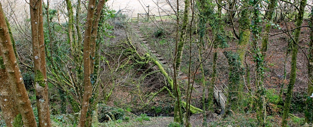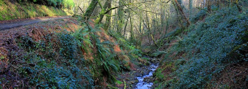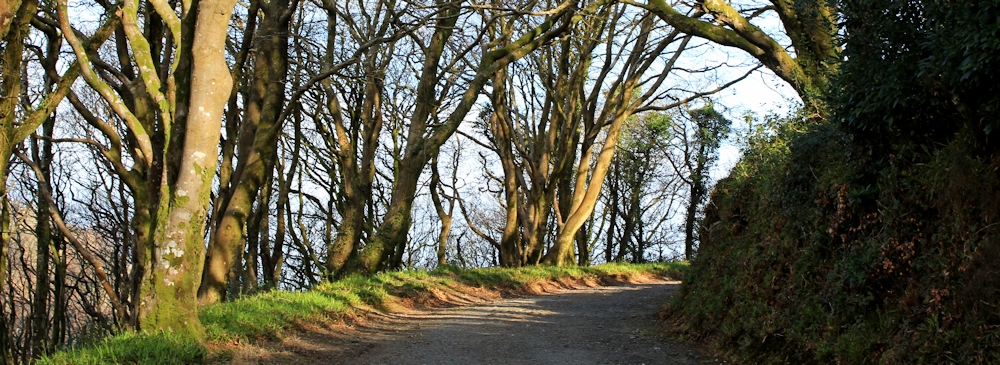 Hobby Drive bends around to join the main A39 at a place called Hobby Lodge. But before this, the South West Coast Path branches off, its welcome acorn sign pointing down into a steep-sided, but shallow, wooded valley.