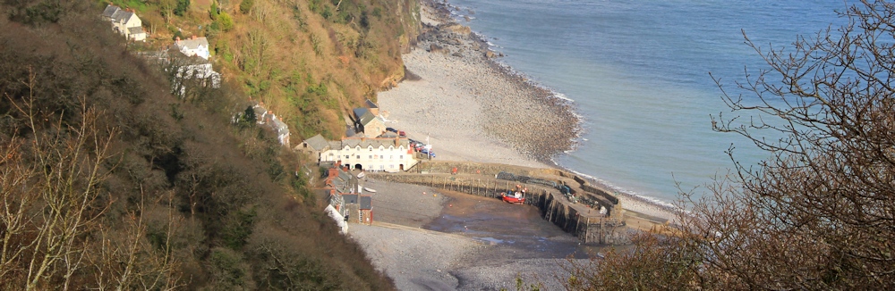 Buck’s Mills is a collection of houses built around a stream that drops down onto the beach in a waterfall. The coast slipway is closed due to damage from the winter storms [local residents took a YouTube video that shows the waves smashing a hole in the concrete]. I look along the coast, but the view is obscured by the mist. What a shame. I think I can just make out the distance stump of Blackchurch Rock.
