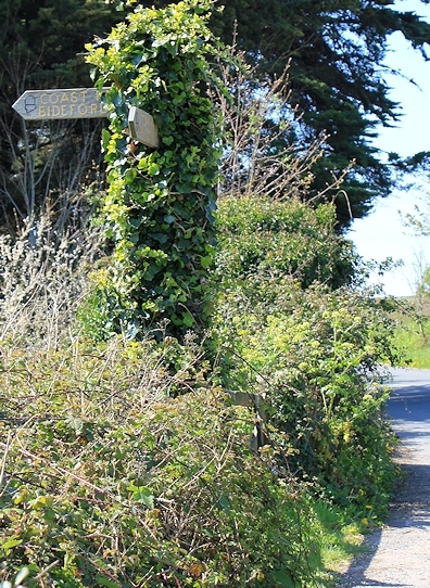 Suddenly I see a foot-path sign, pointing to the left, almost overgrown with ivy. What a relief!