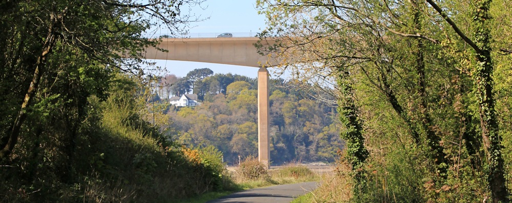 After stopping on a bench for a quick snack, I come down out of the trees and am walking by the river again. The tall bridge ahead is a modern road-bridge, taking the A39 over the river.