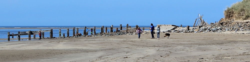 I come to an area where wooden posts stick out of the sand and form lines marching down the beach. This must be all that remains of ‘The Groynes’, as marked on my map.