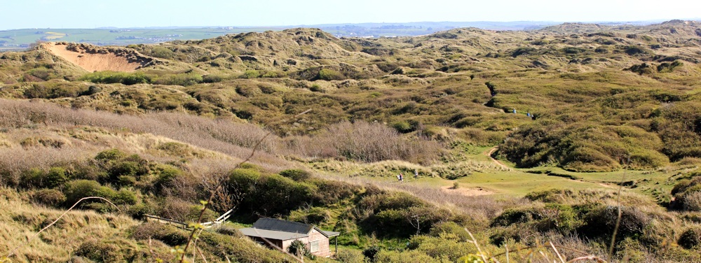 As I climb up the road, I get a wonderful view of the Braunton Burrows. It is an immense area of vegetated dune, the largest in England. And I can trace the path of the official SWCP and see people walking along it.