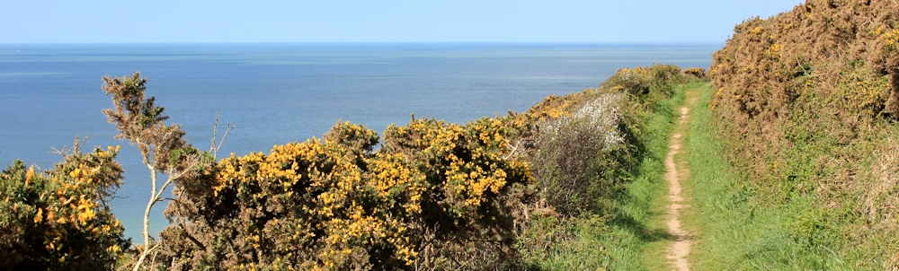 The path leads straight ahead, with gorse bushes on either side, for about a mile. I meet a few groups of families and strollers. The sky is blue, the sun is bright, and I am full of energy.