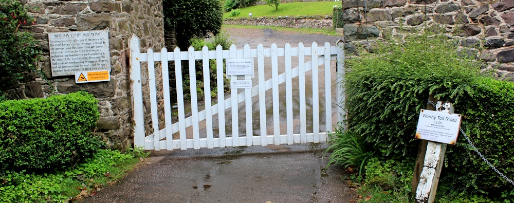 The track ends at a road, where I see a gate and a sign. It’s another toll road and another honesty box. £2 for a shortcut through the estate from Porlock Weir to the A39, saving a long detour by road. But it’s for cars only, cyclists and walkers aren’t allowed.